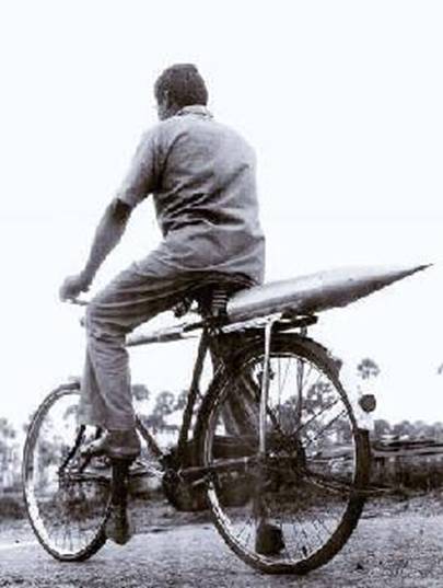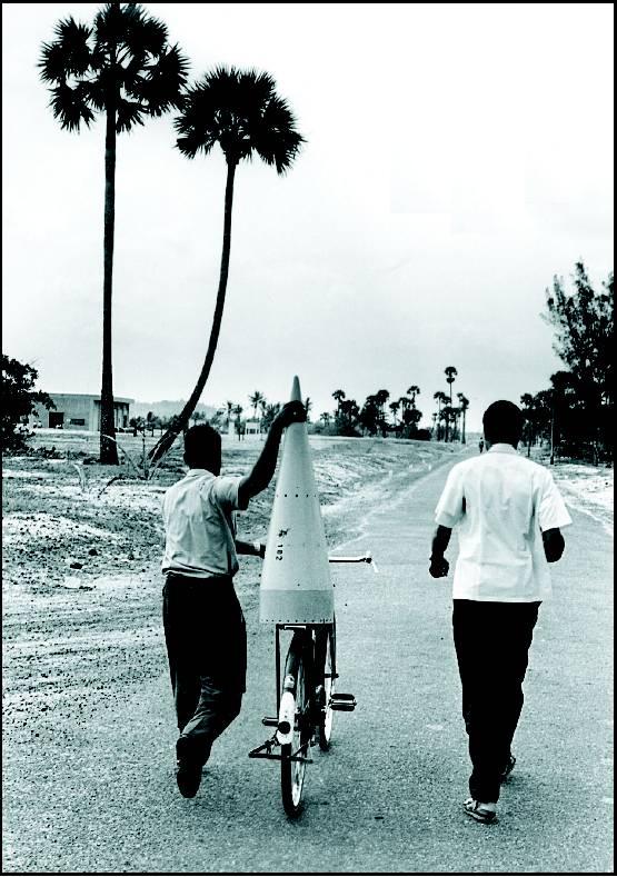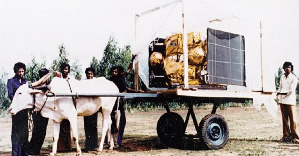 Kaum ein Beitrag über die Geschichte der indischen Raumfahrt kommt ohne ikonische Bilder aus, bei denen Raketenteile auf einem Fahrrad und ein Satellit auf einem Ochsenkarren transportiert werden. Die Bilder zeigen aber vor allem: Indien weiß, wie es mit den vergleichsweise geringen finanziellen Mitteln bis heute erfolgreich ist. Zu sehen sind der Transport der Nike Apache und der APPLE-Satellit, der 1981 im Rahmen einer ESA-Kooperation ins All gebracht wurde.